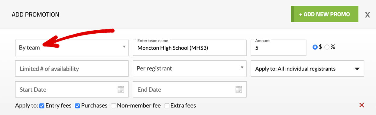 - Step 4: For the type, choose 'By Team', then enter the name of the team you want to apply the discount to (e.g., Moncton High School (MHS3)). Set the discount amount (either a fixed dollar amount or a percentage), and configure any additional options if needed.