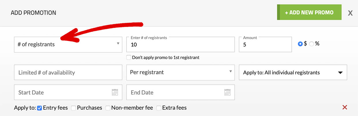 - Step 4: For the type, choose '# of Registrants,' then enter the threshold number of entries required to qualify for the discount (e.g., 10). Set the discount amount (either a fixed dollar amount or a percentage), and configure any additional options if needed.