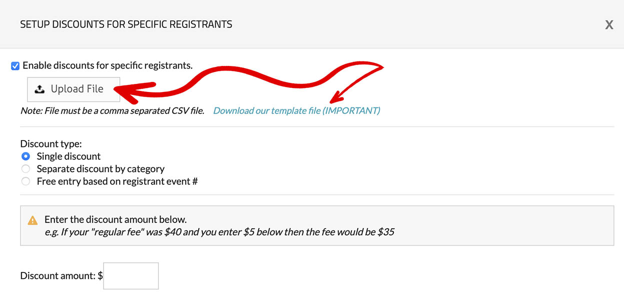 - Step 4: Download our template file, open it in a program like Microsoft Excel, add the names of individuals eligible for a discount, and re-upload the file.