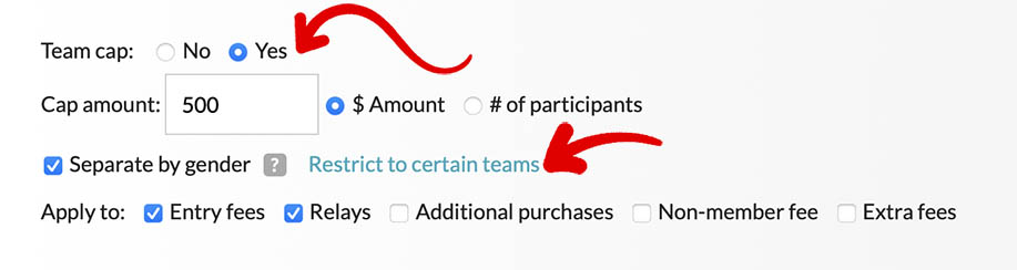 - Step 3: Specify the settings for 'Cap Amount,' including whether you want to 'Separate by Gender' (e.g., $500 per team per gender—$500 for Male teams and $500 for Female teams). You can also choose to restrict the cap to certain teams (e.g., only universities) and define which fees are included in the cap.