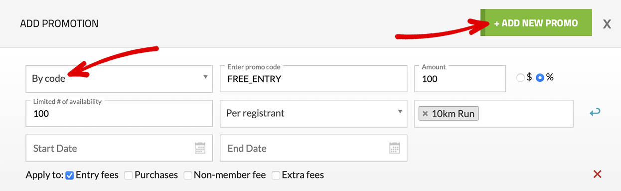 - Step 4: For the type, choose 'By Code', then enter the promo code (e.g. FREE_ENTRY). Set the discount amount (either a fixed $ amount or a percentage), limit the number of uses (e.g., only valid for the first 100 redemptions), specify who is eligible for the discount (e.g., 10km participants only), and define the start and end dates for the promo code, if applicable.