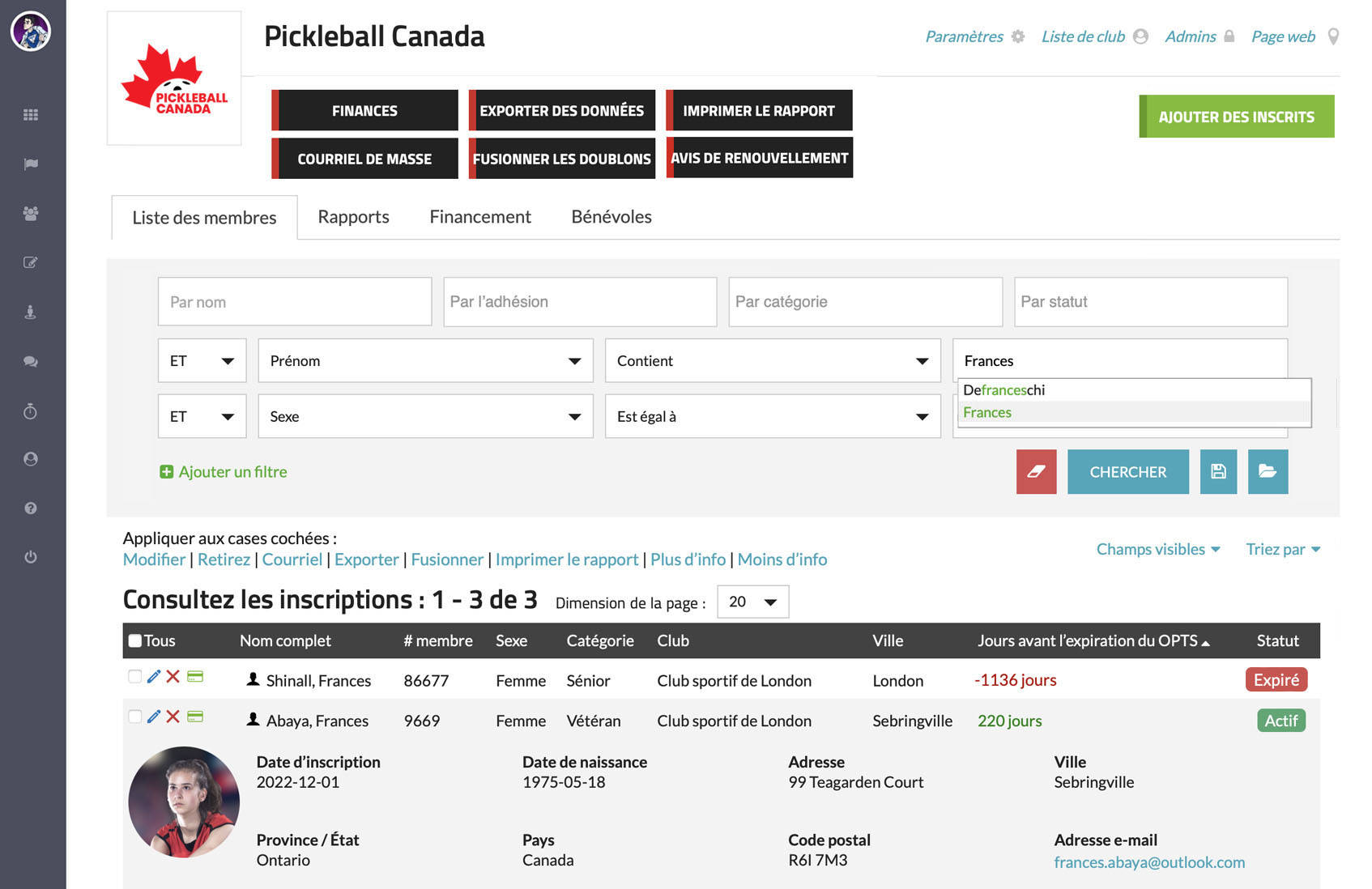 La gestion des membres est au cœur du système de Pickleball Canada, offrant une solution complète permettant à Pickleball Canada, aux provinces/territoires et aux clubs de visualiser et de gérer efficacement leurs listes de membres. Notre plateforme présente une interface intuitive et accueillante qui simplifie le processus de gestion et le rend accessible à tous les utilisateurs. Des options de filtrage avancées permettent d'effectuer des recherches rapides et précises, tandis que des outils de rapports robustes fournissent des informations précieuses sur les données relatives aux membres. De plus, les organisations peuvent exporter les données des membres en tout temps, ce qui leur assure un contrôle et une flexibilité complets. Ce système rationalisé est conçu pour gagner du temps, améliorer la précision et soutenir la croissance et l'organisation de Pickleball Canada et de ses groupes affiliés.