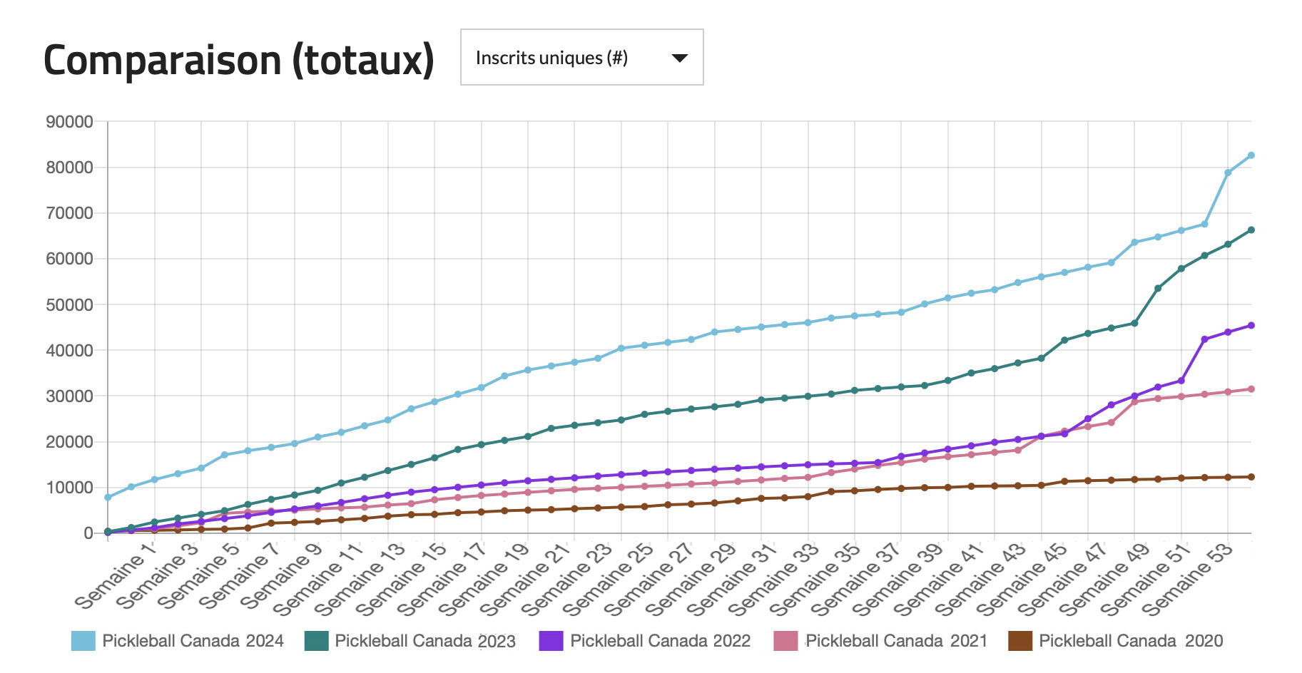 Dès les premiers jours de notre partenariat, Pickleball Canada a connu une croissance rapide. Ayant débuté avec un nombre modeste de clubs et de joueurs, l'organisme a depuis pris beaucoup d'expansion. Cette croissance témoigne de la popularité du pickleball et de son engagement à favoriser une communauté forte. En particulier, le nombre de membres de l'organisation est monté en flèche, passant d'un peu plus de 10 000 membres actifs annuels au début de notre partenariat à près de 85 000 membres actifs annuels quatre ans plus tard. Un facteur clé dans la gestion de cette croissance rapide a été l'utilisation de notre système, qui a permis de rationaliser les opérations, de simplifier la gestion des membres et d'assurer une expérience transparente pour les joueurs à travers le pays.