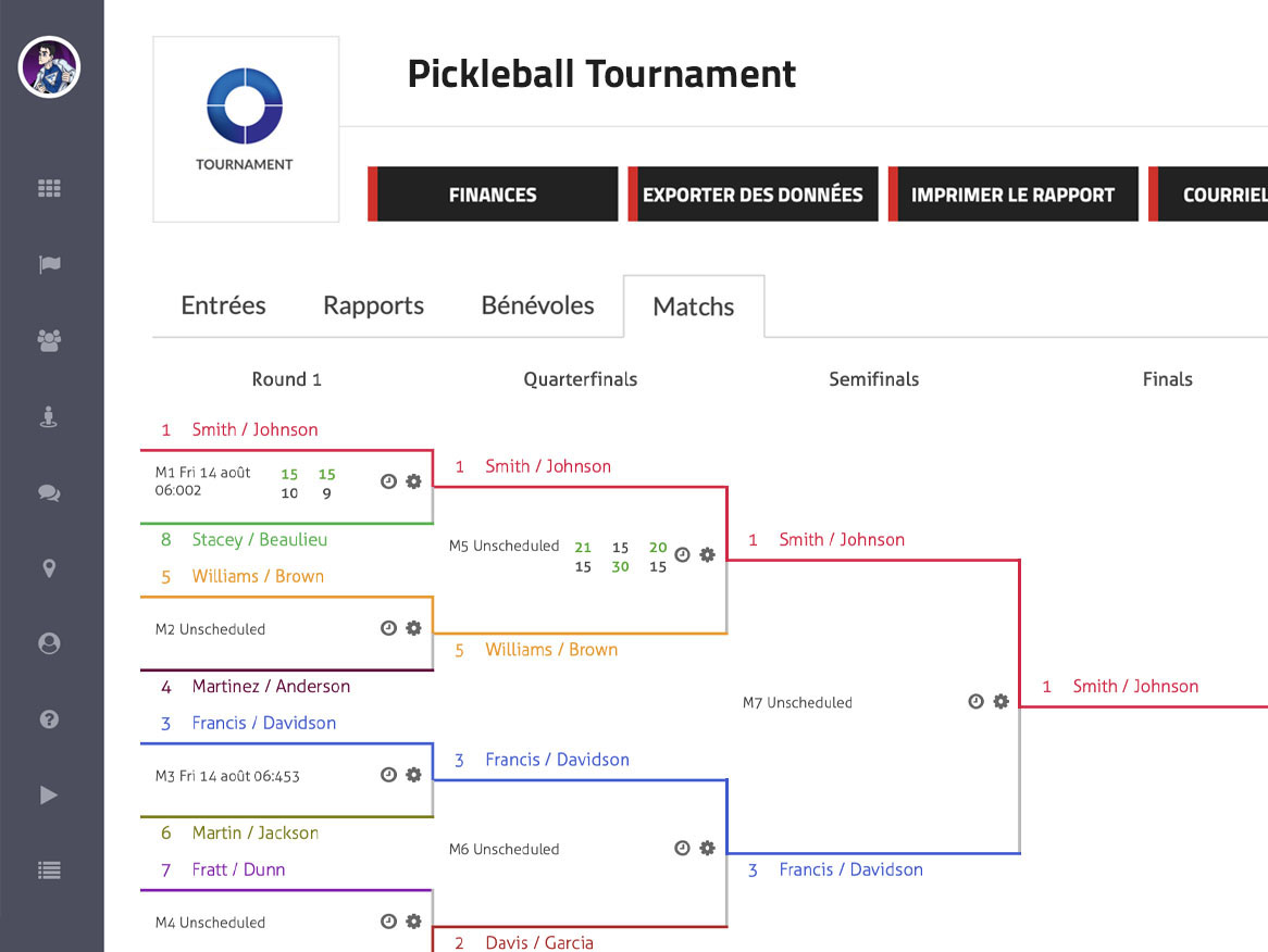 Outre les outils d'inscription, le système offre de solides fonctions de création de matchs et de programmation. Les organisateurs peuvent mettre en place des tournois à élimination simple, à double élimination et des tournois à la ronde directement à partir de la plateforme. Les matchs peuvent être programmés efficacement, grâce à des outils permettant de gérer les créneaux horaires et l'affectation des courts. Pour rationaliser les opérations le jour de l'événement, la plateforme intègre également une application d'enregistrement par code QR, permettant aux participants d'être enregistrés rapidement et en toute sécurité à l'aide de leur code QR unique.