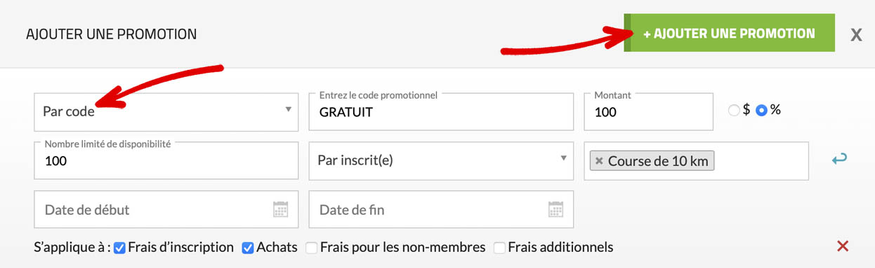• Étape 4 : Pour le type, choisissez « Par code », puis saisissez le code promotionnel (par exemple, GRATUIT). Définissez le montant de la réduction (soit un montant fixe en dollars, soit un pourcentage), limitez le nombre d'utilisations (par exemple, valable uniquement pour les 100 premières utilisations), précisez qui peut bénéficier de la réduction (par exemple, uniquement les participants au 10 km) et définissez les dates de début et de fin du code promotionnel, le cas échéant.