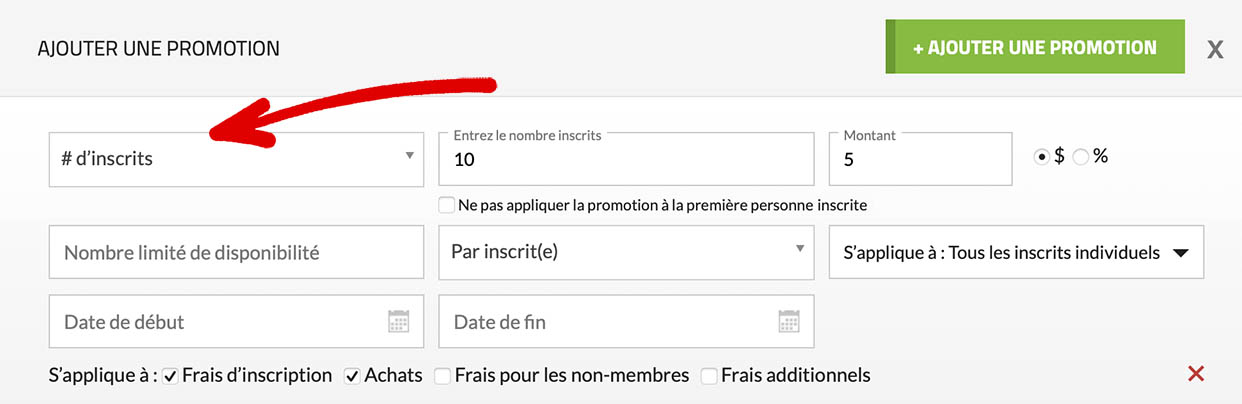 • Étape 4 : Pour le type, choisissez « # d'inscrits », puis entrez le nombre minimum d'inscriptions requis pour bénéficier de la réduction (par exemple, 10). Définissez le montant de la remise (soit un montant fixe en dollars, soit un pourcentage) et configurez d'autres options si nécessaire.