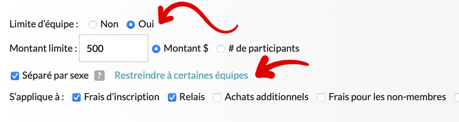• Étape 3 : Spécifiez les paramètres du « Montant limite ", y compris si vous souhaitez " Séparer par sexe " (par exemple, 500 $ par équipe et par sexe - 500 $ pour les équipes masculines et 500 $ pour les équipes féminines). Vous pouvez également choisir de limiter le montant maximal à certaines équipes (par exemple, uniquement les universités) et définir les frais inclus dans le montant limite.