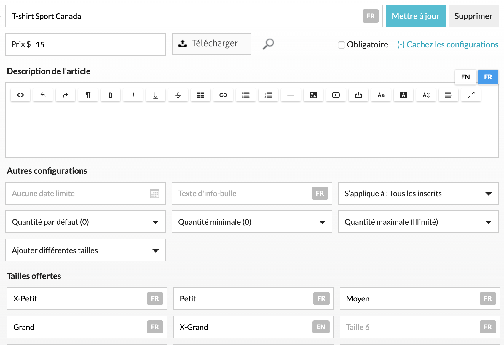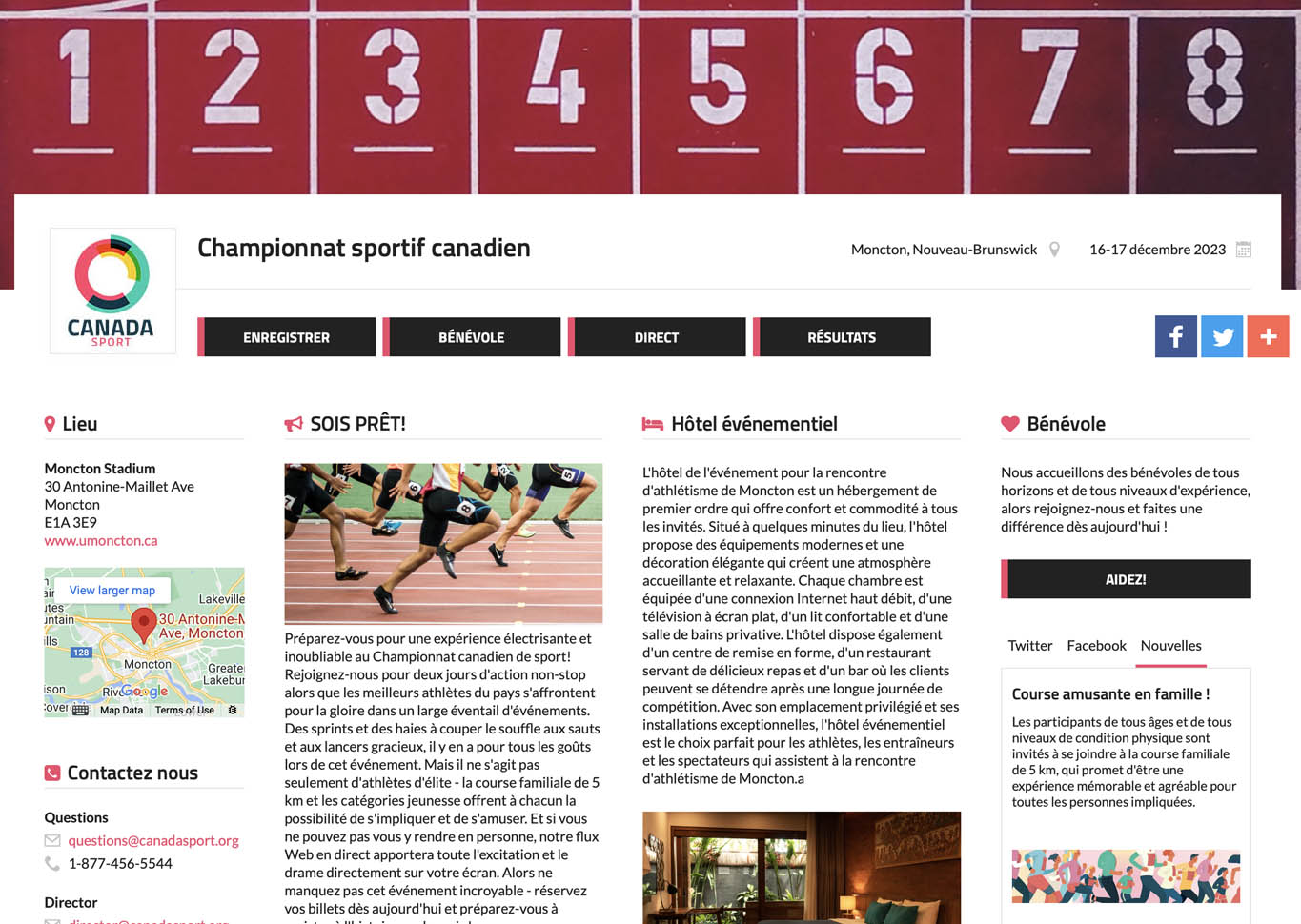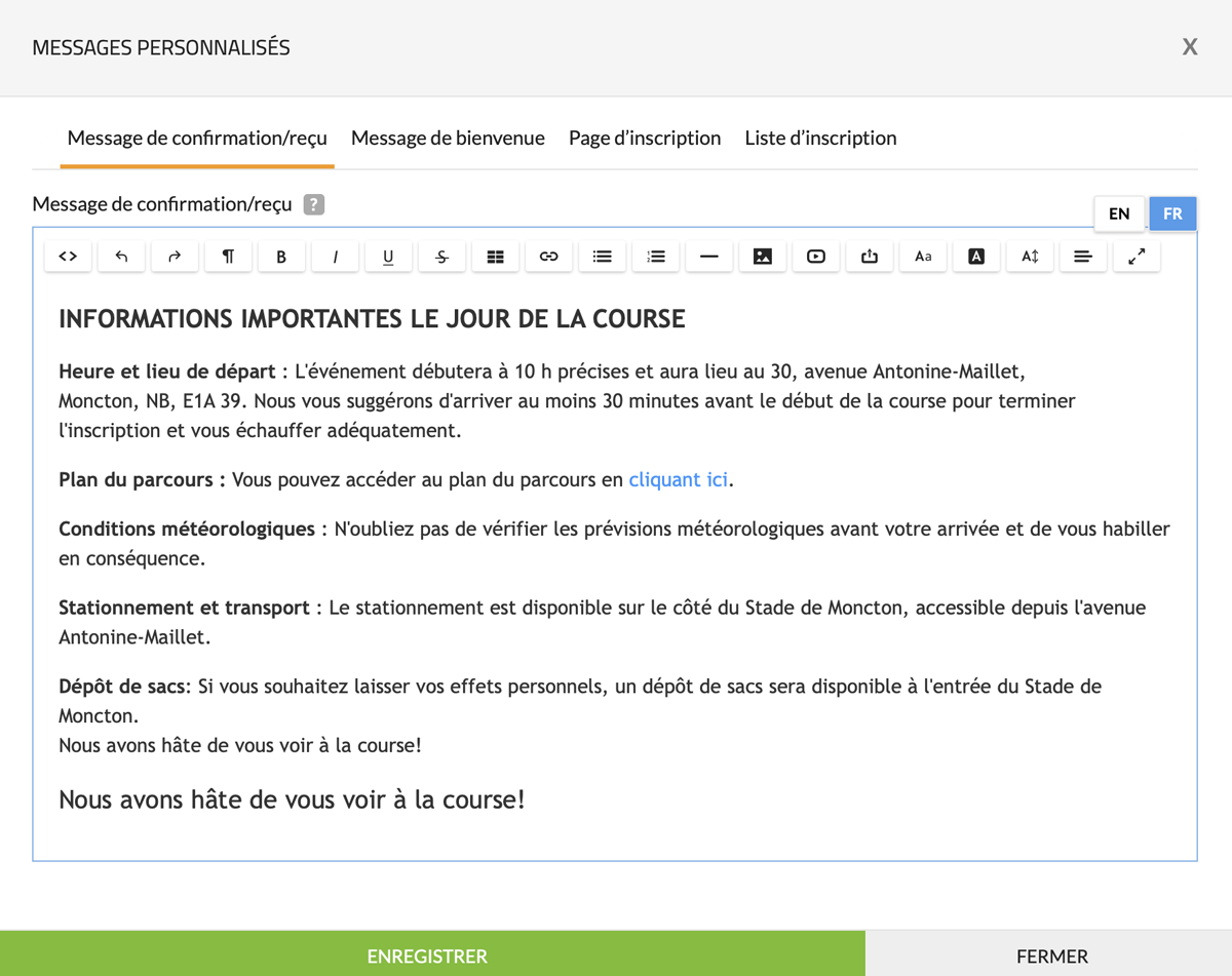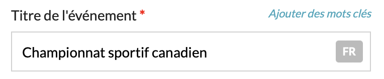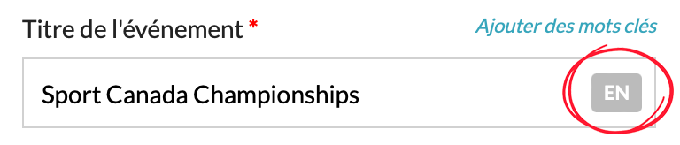 Le « titre de votre événement » fait référence au nom officiel de votre événement, tel que « Championnat canadien de sport ». Pour les champs de saisie qui permettent des entrées bilingues (français/anglais), vous remarquerez un bouton de basculement EN/FR qui vous permet d’entrer les deux versions. Même si vous n’avez pas de version française, le système affichera la version anglaise pour tous ceux qui consulteront votre page. |