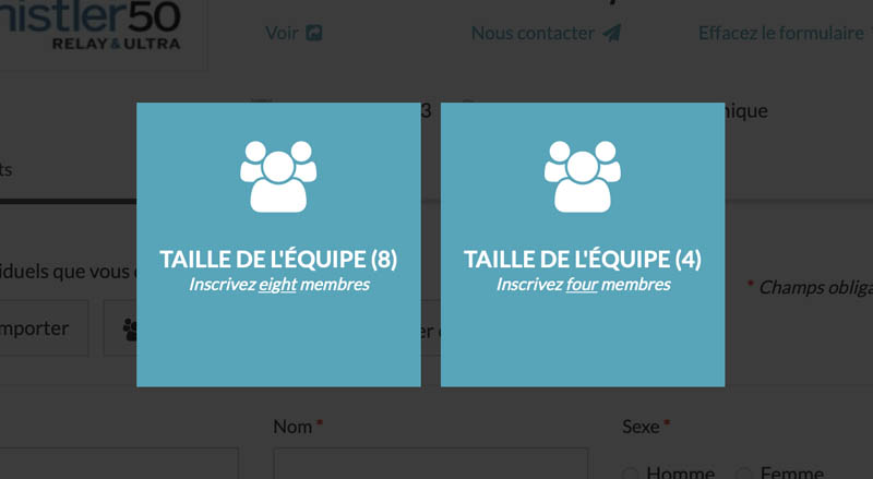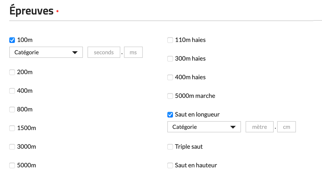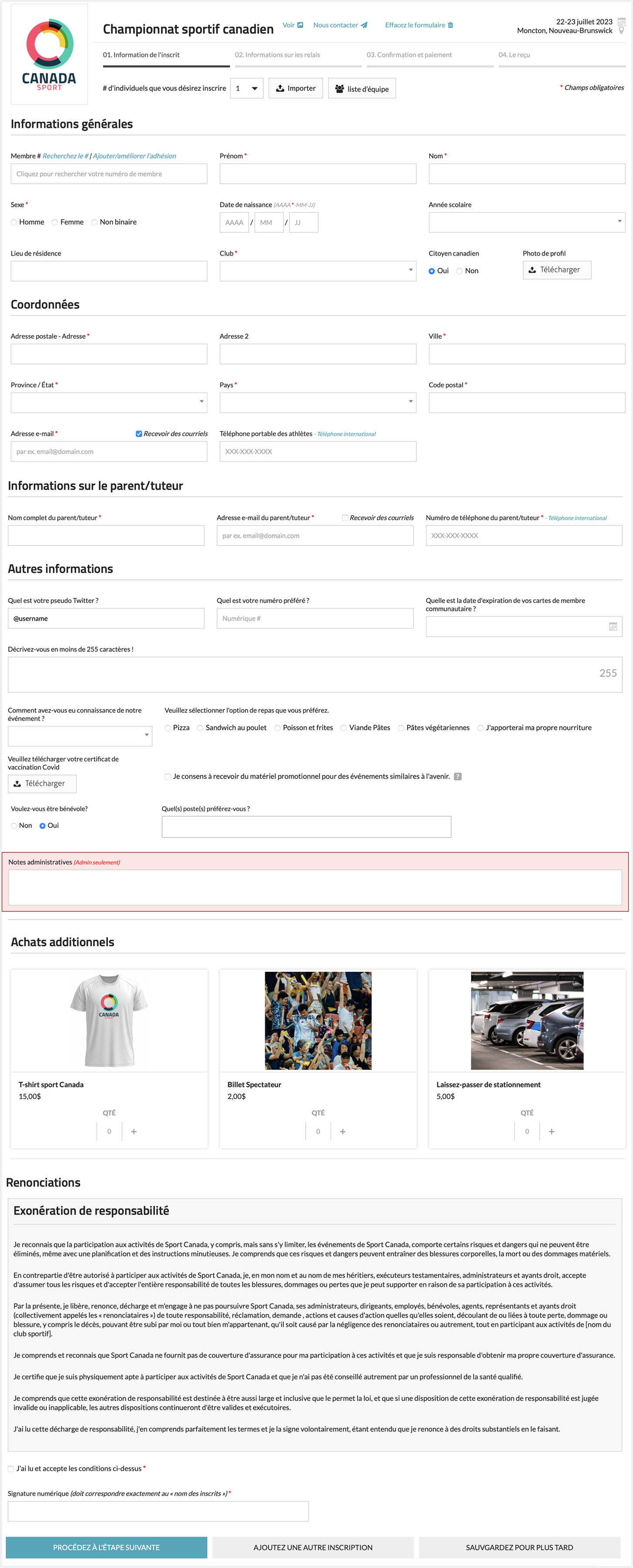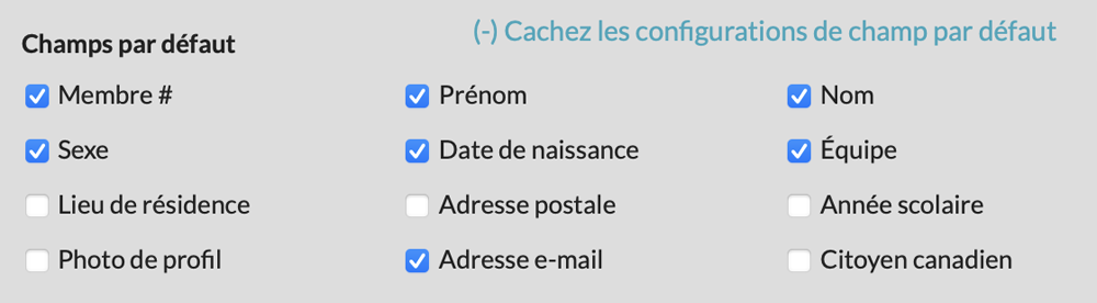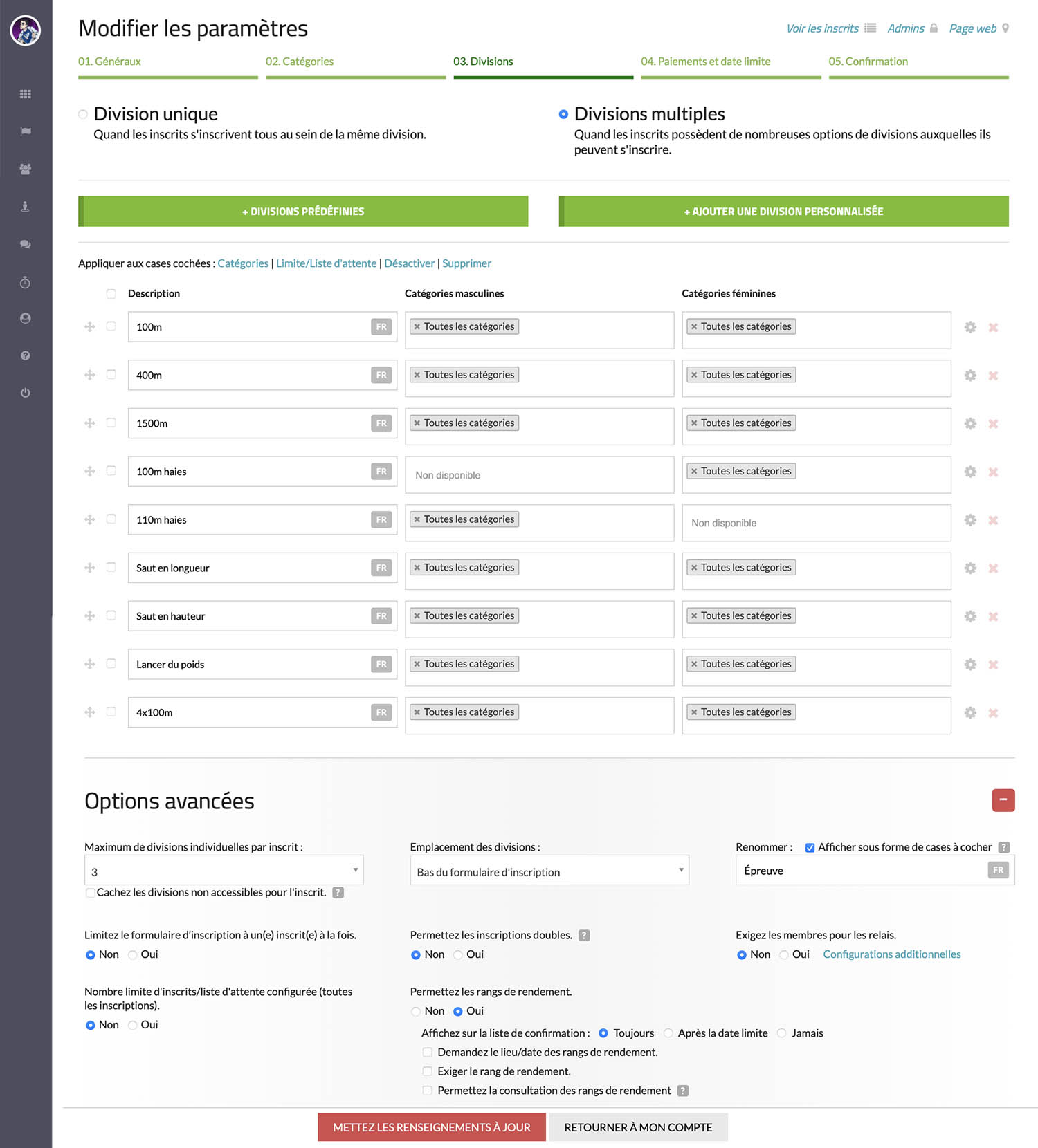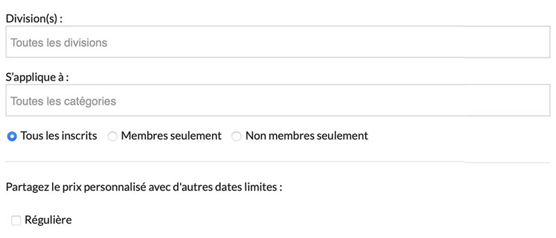 Ce paramètre vous permet de combiner différentes inscriptions à des événements dans une seule liste de confirmation. Par exemple, si vous souhaitez créer des formulaires d’inscription distincts pour les athlètes des équipes provinciales et les athlètes libres, vous pouvez toujours combiner leurs inscriptions pour qu’elles apparaissent ensemble. |