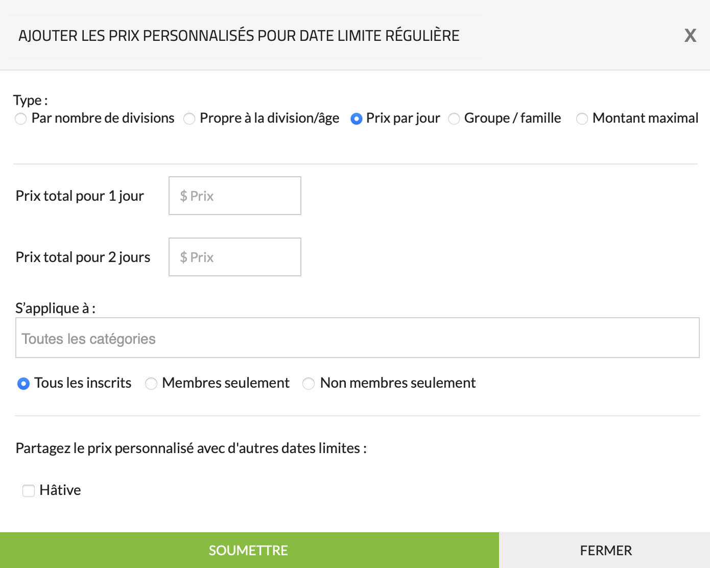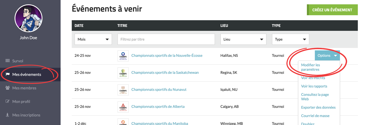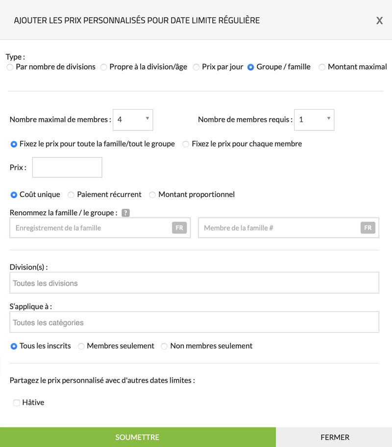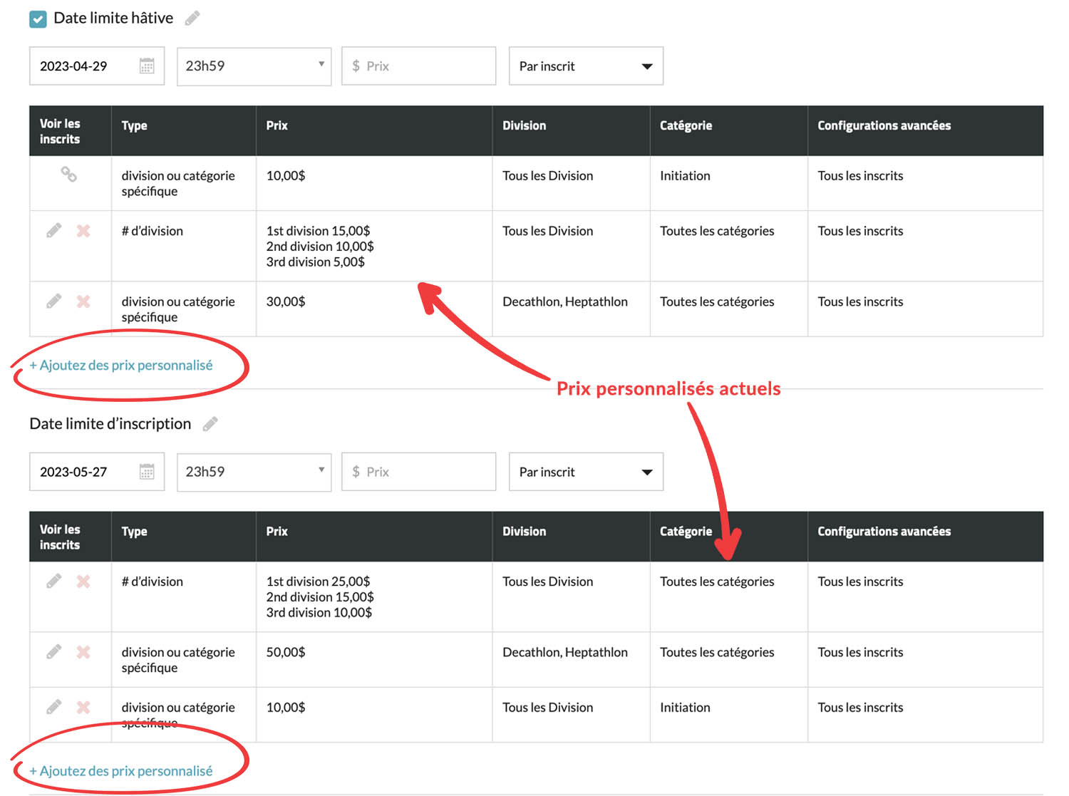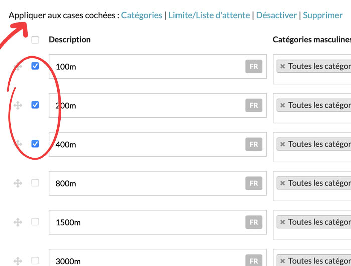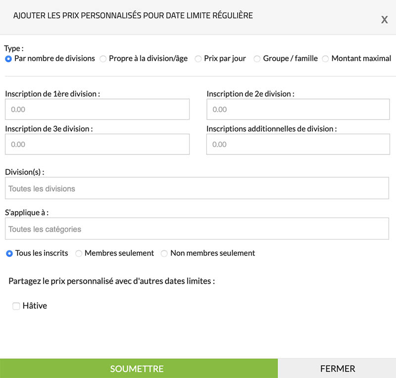 Ce paramètre vous permet de combiner différentes inscriptions à des événements dans une seule liste de confirmation. Par exemple, si vous souhaitez créer des formulaires d’inscription distincts pour les athlètes des équipes provinciales et les athlètes libres, vous pouvez toujours combiner leurs inscriptions pour qu’elles apparaissent ensemble. |