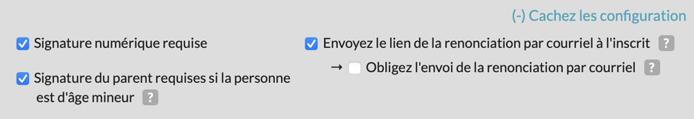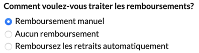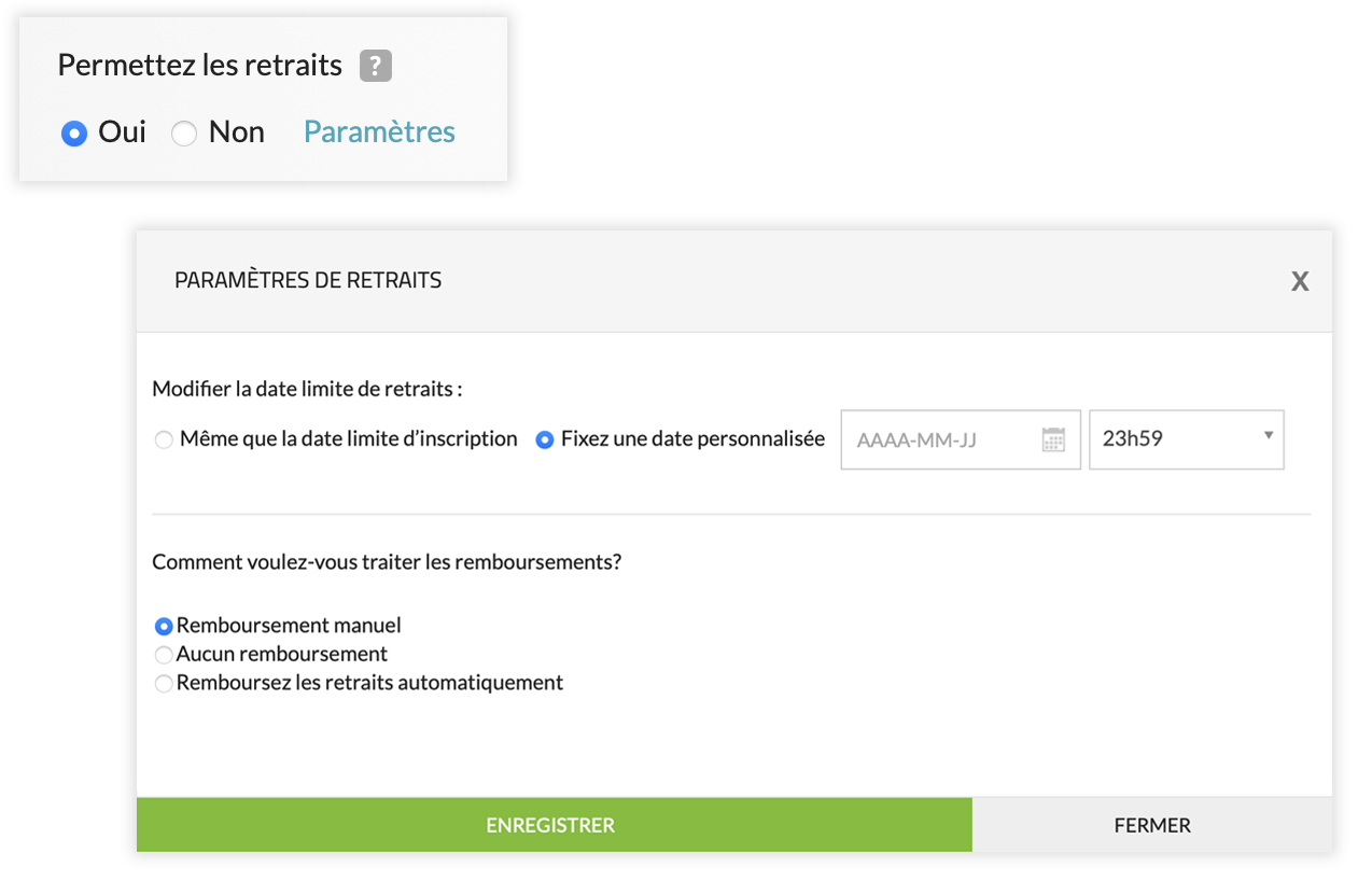 Permet aux inscrits d’annuler leur propre inscription. Le lien « paramètres » vous permet de fixer une date limite d’annulation et de déterminer la procédure de traitement des remboursements. Pour en savoir plus sur l’envoi des remboursements, cliquez ici. |
