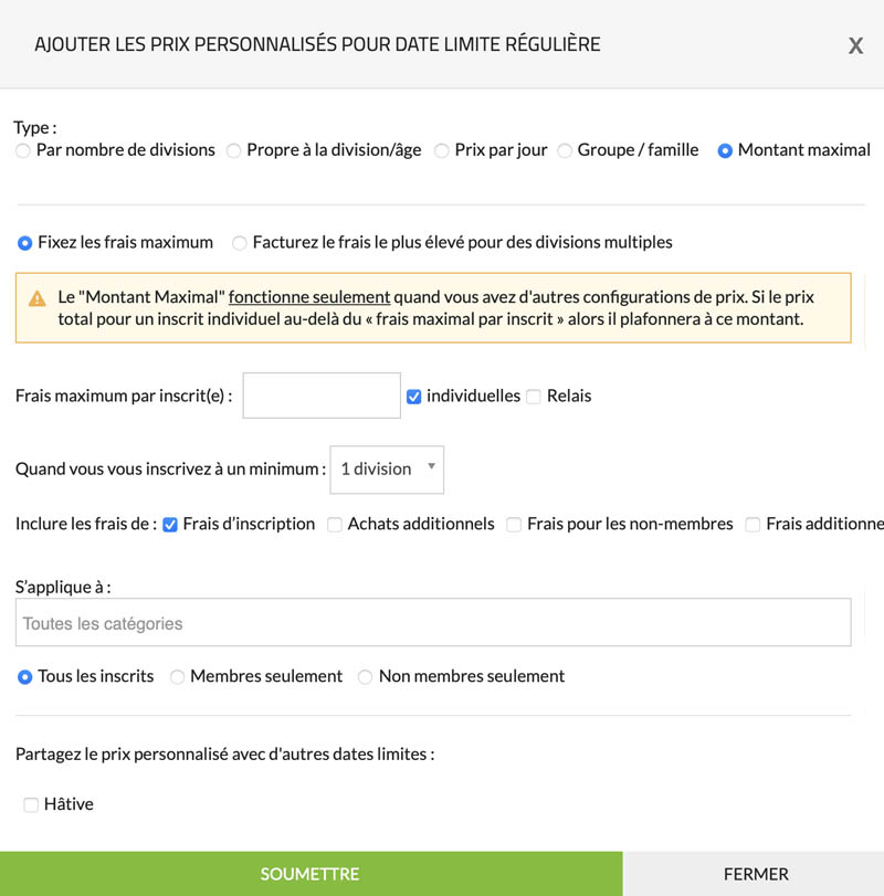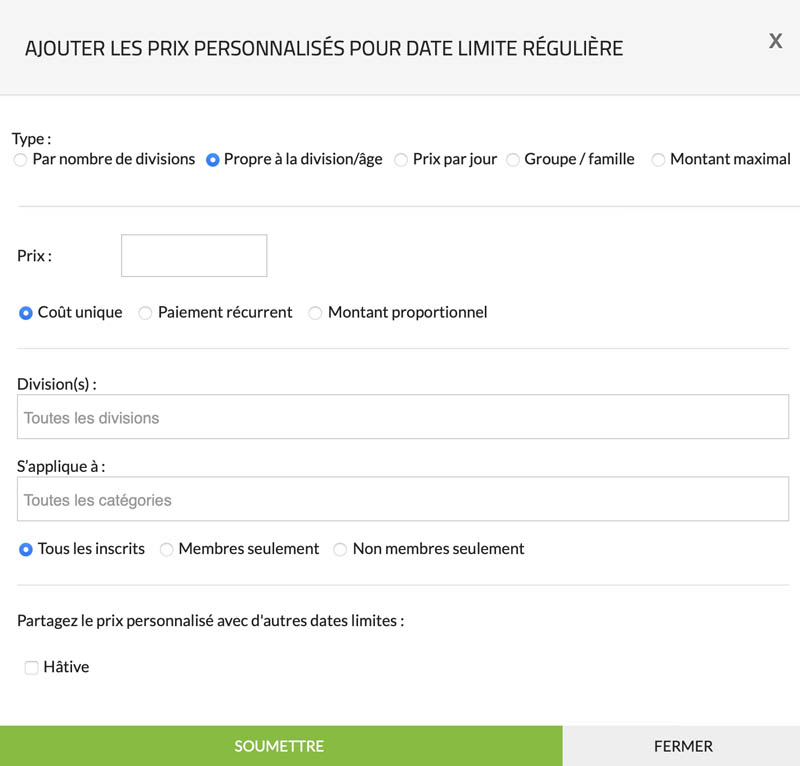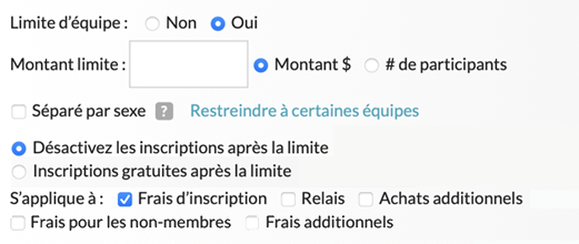 Ce paramètre vous permet de limiter l’accès à votre formulaire d’inscription à certaines adresses électroniques. Pour s’inscrire à votre événement, les personnes devront d’abord se connecter à l’aide de leur adresse électronique. Si l’option « Autoriser l’inscription d’autres personnes en tant que personnes indépendantes » est sélectionnée, n’importe qui peut s’inscrire à votre événement. Toutefois, si leur adresse électronique ne figure pas dans votre liste, ils devront s’inscrire en tant qu’« indépendant » (c’est-à-dire sans pouvoir choisir un club ou une équipe). |
