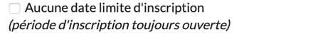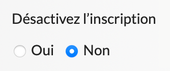 Ce paramètre vous permet de désactiver votre formulaire d’inscription, empêchant ainsi toute personne de s’inscrire à votre événement. Toutefois, en tant qu’administrateur(trice), vous y aurez toujours accès.