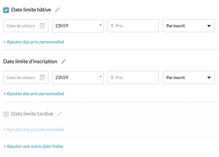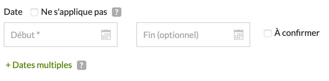 Vous permet de préciser la ou les dates auxquelles votre événement aura lieu. Si vous n’êtes pas sûr de la date, vous pouvez cocher la case « À confirmer ». Si une date ne s’applique pas à votre événement, cochez la case « Ne s’applique pas ». L’option « + Dates multiples » est uniquement utilisée à des fins visuelles. Cette option ne permet pas aux participants de s’inscrire à chaque date séparément. |