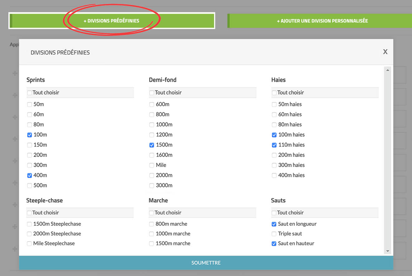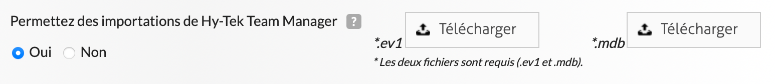 Ce paramètre vous permet de télécharger votre fichier Hy-Tek Meet Manager (*.ev1) afin de permettre aux entraîneurs de travailler sur leurs inscriptions à l’aide de Hy-Tek Team Manager et de les importer ensuite dans Trackie. Vous pouvez créer votre fichier de rencontres (*.ev1) dans Hy-Tek Meet Manager en choisissant « Fichier » → « Export » → « Événements pour le gestionnaire d’équipe ». |