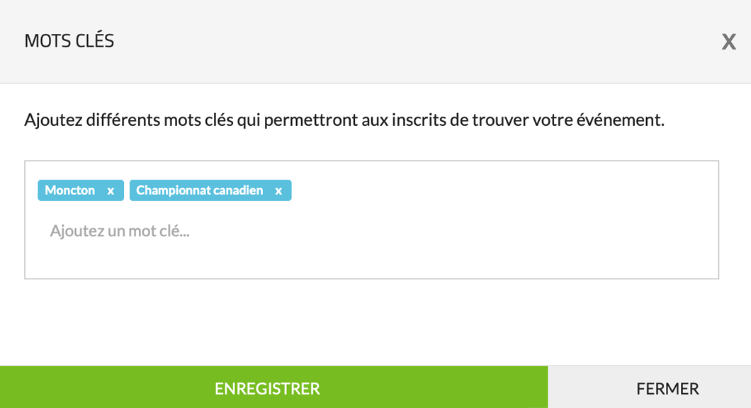 Pour accéder à la fenêtre contextuelle « Ajouter des mots-clés », cliquez sur le lien à droite du « Titre de l’événement ». Cette fonction vous permet d’inclure divers mots-clés ou phrases qui, selon vous, aideront les personnes à découvrir votre événement dans notre « calendrier ». |