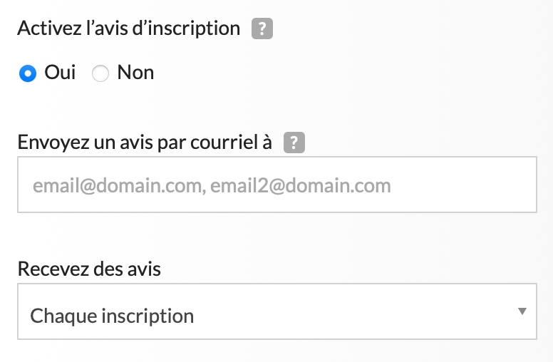 Vous permet de recevoir des avis par courriel lorsque des personnes s’inscrivent à votre événement. Vous pouvez saisir plusieurs adresses électroniques en les séparant par une virgule.