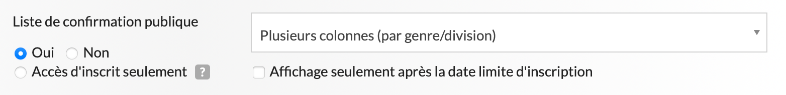 Cette fonction vous permet de contrôler la visibilité de la liste des inscriptions à votre événement. Si la valeur est « oui », la liste sera accessible à tous; si la valeur est « non », seul l’administrateur(trice) peut la consulter; et si la valeur est « accès aux inscrits seulement », seuls les inscrits peuvent accéder à la liste de confirmation. En cochant l’option « Afficher seulement après la date limite d’inscription », votre liste de confirmation publique sera masquée au public jusqu’à ce que la date limite d’inscription soit passée. Format de la liste de confirmation Ce paramètre vous permet de modifier le format de votre confirmation.