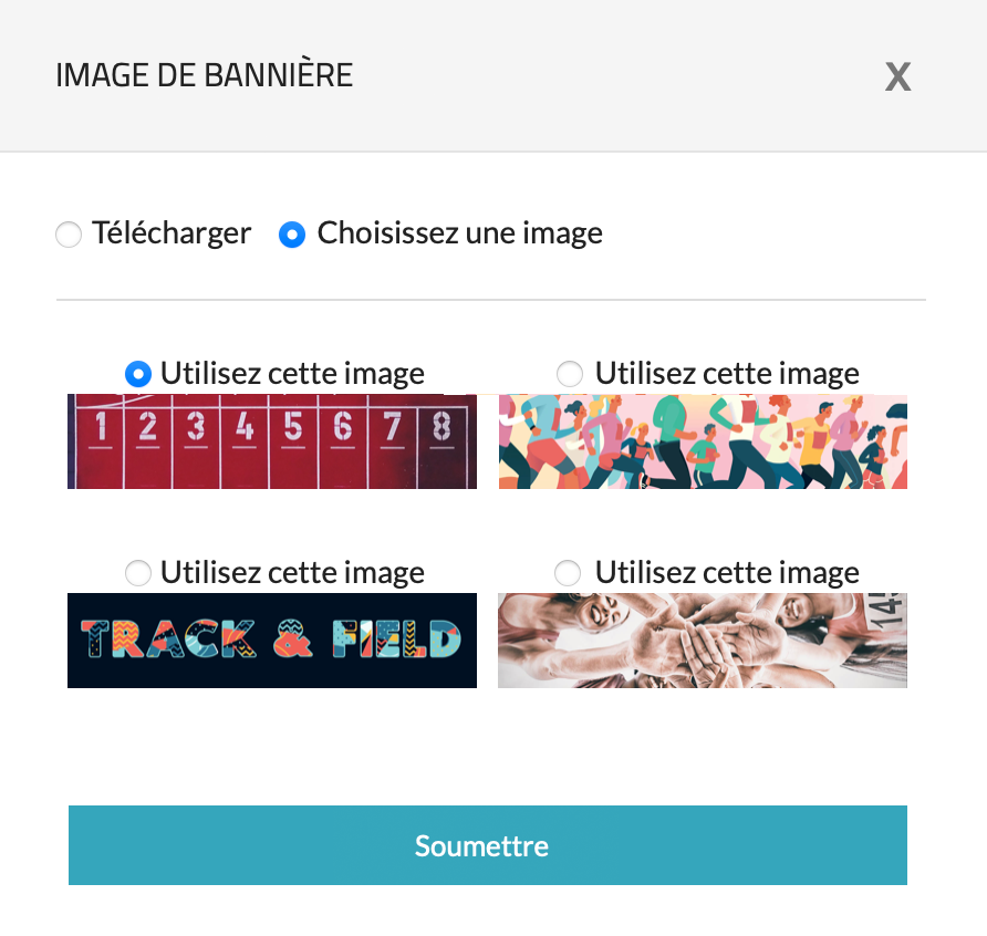 Vous avez la possibilité de télécharger vos propres images de bannières ou de sélectionner l’une de nos images de bannières en stock, qui seront affichées sur la page web de votre événement.
