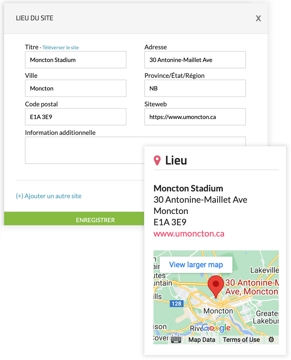 Pour accéder à la fenêtre contextuelle « Ajouter le lieu du site », cliquez sur le lien à droite de « Ville ». En ajoutant l’adresse du ou des lieux où se déroule votre événement, vous pouvez créer une carte interactive sur la page Web de votre événement. |