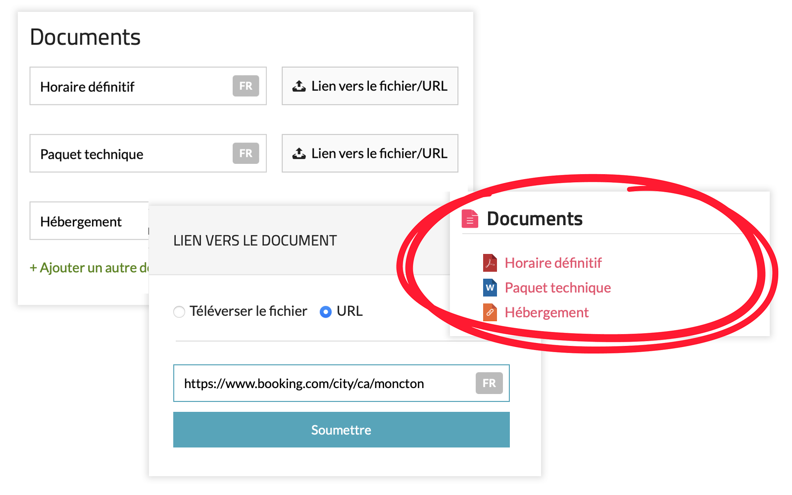 Vous avez la possibilité de téléverser divers documents ou de créer des liens vers des sites Web externes qui peuvent être utiles à vos participants pour obtenir des informations supplémentaires sur votre événement. Une fois que vous aurez ajouté des documents supplémentaires, ils apparaîtront sur la page Web de votre événement dans une présentation similaire à celle de l’image ci-dessus. |