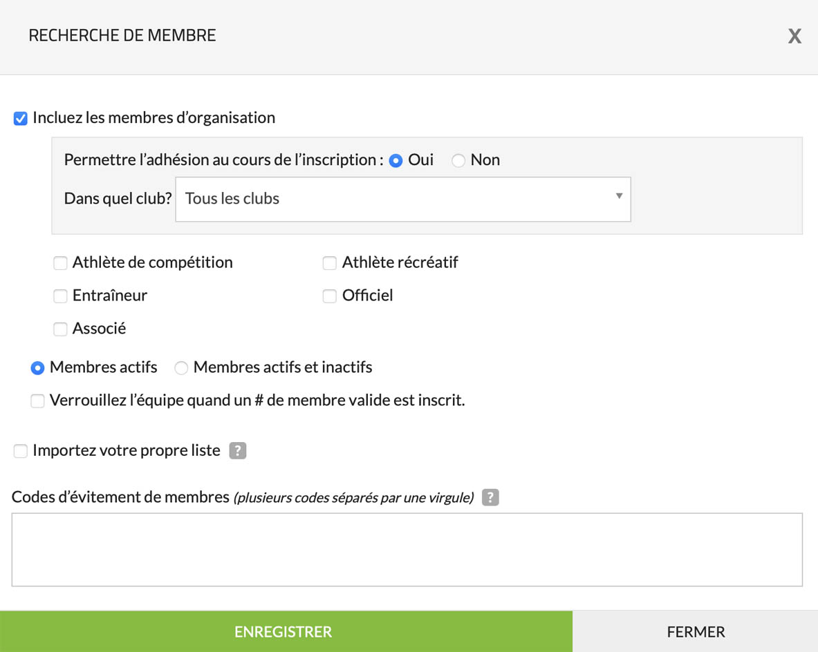 Ce paramètre vous permet de valider le champ « # membre » par rapport aux données de votre organisation. Si votre organisation a différents types de membres, ils seront répertoriés afin que vous puissiez cocher les types à valider. Cela peut s’avérer utile si vous exigez des inscrits qu’ils aient un type d’adhésion spécifique, comme être un(e) entraîneur(e) pour un cours de formation, par exemple.