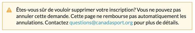 Veuillez noter que, dans certains cas, certains événements ou clubs peuvent avoir désactivé l’option de suppression des inscriptions (ou peuvent avoir fixé une date limite). Si vous ne parvenez pas à supprimer votre inscription, il est conseillé de contacter directement l’événement ou le club pour obtenir de l’aide..