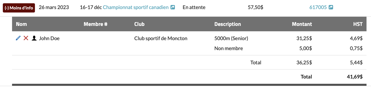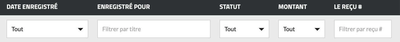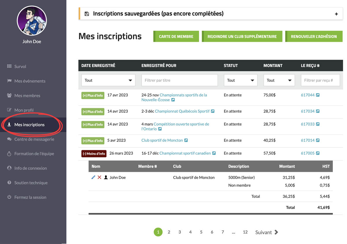 Chacune de vos inscriptions antérieures apparaîtra sur une ligne distincte. À partir de là, vous pouvez cliquer sur « (+) Plus d’info » pour obtenir plus d’informations sur cette transaction, cliquer sur le titre de l’événement (ou le nom du club) pour obtenir plus d’informations sur cet événement (ou ce club), ou cliquer sur l’identifiant du reçu pour afficher le reçu original. |