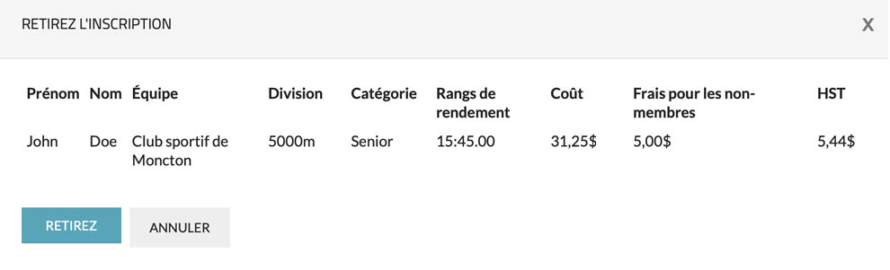Permet d’annuler une inscription. Veuillez noter que pour certains événements et clubs, l’annulation d’une inscription peut être désactivée ou avoir une date limite d’annulation. Si vous ne parvenez pas à annuler votre inscription, il est recommandé de contacter irectement l’événement ou le club concerné.