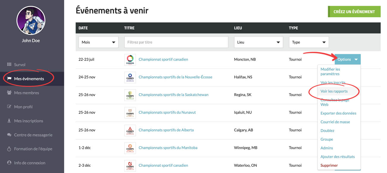 Allez dans la section « Mes événements » ou « Mes membres », puis cliquez sur le bouton « Options » et sur l’option « Voir les rapports ».