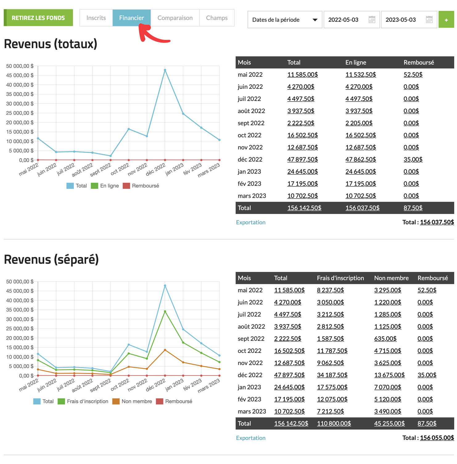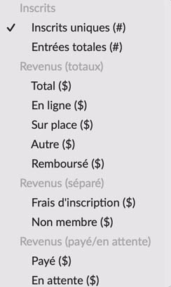 Revenus (séparé) : Ce rapport présente une ventilation complète de vos revenus, classés en fonction de la tarification que vous avez mise en place, comme les frais d’inscription, les frais des non-membres, les frais supplémentaires et les achats additionnels.