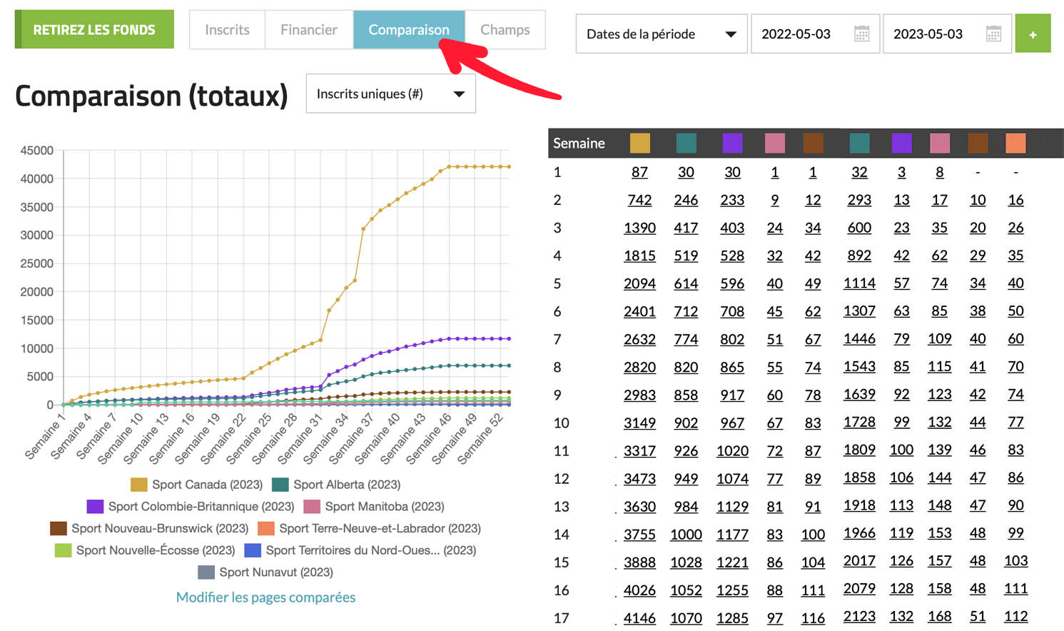 Comparaison (totaux) : Ce rapport vous permet de comparer les données d’inscription de différents clubs ou événements auxquels vous avez accès. Il peut s’avérer utile pour comparer des événements sur plusieurs années et fournir des informations sur les tendances de croissance ou de déclin.