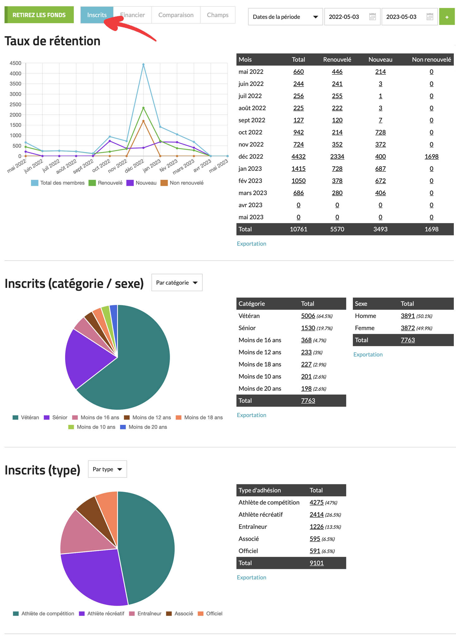 Inscrits (type) : Ce rapport fournit des informations basées sur les divisions (ou types d’adhésion) de vos inscrits.