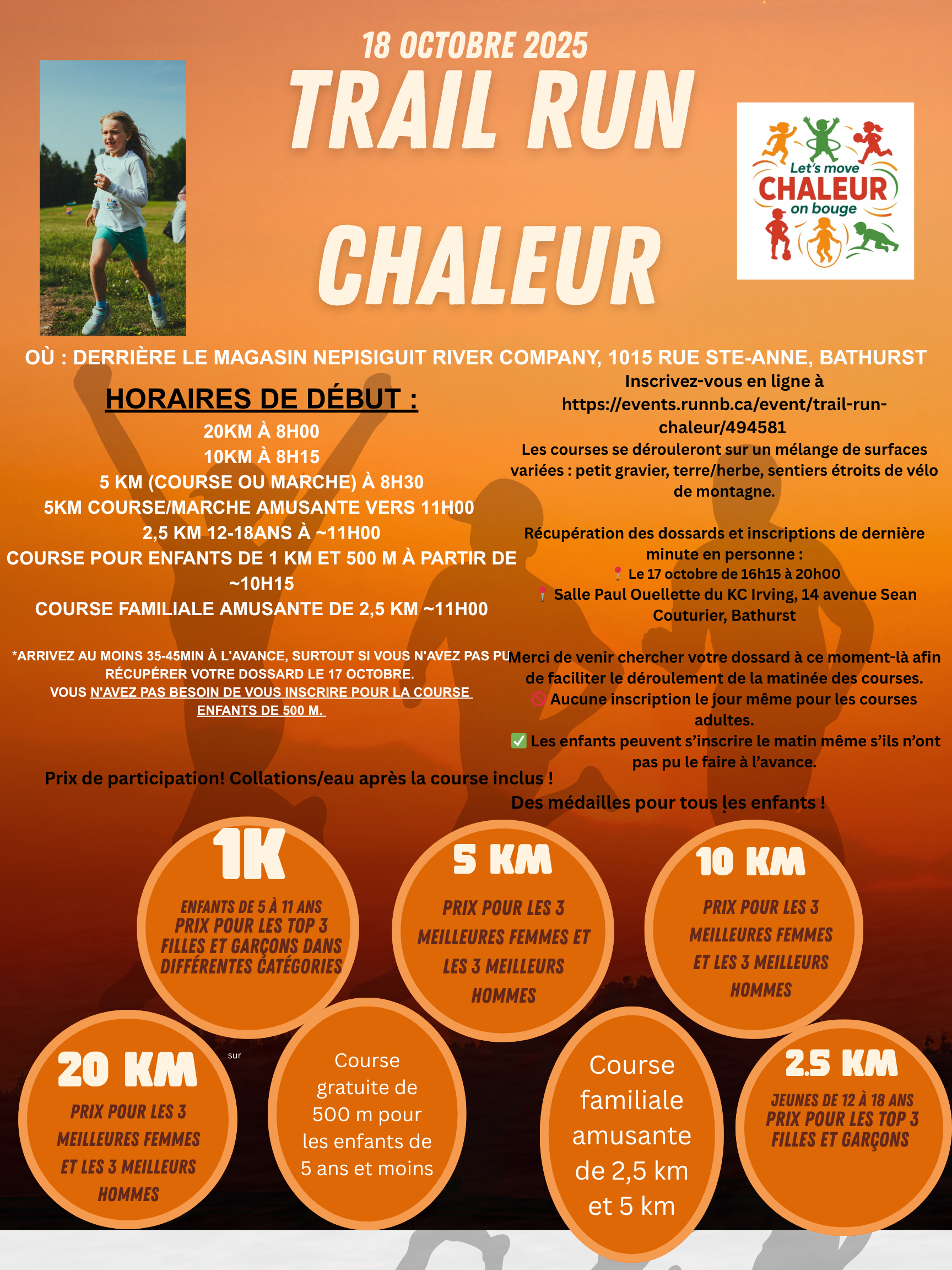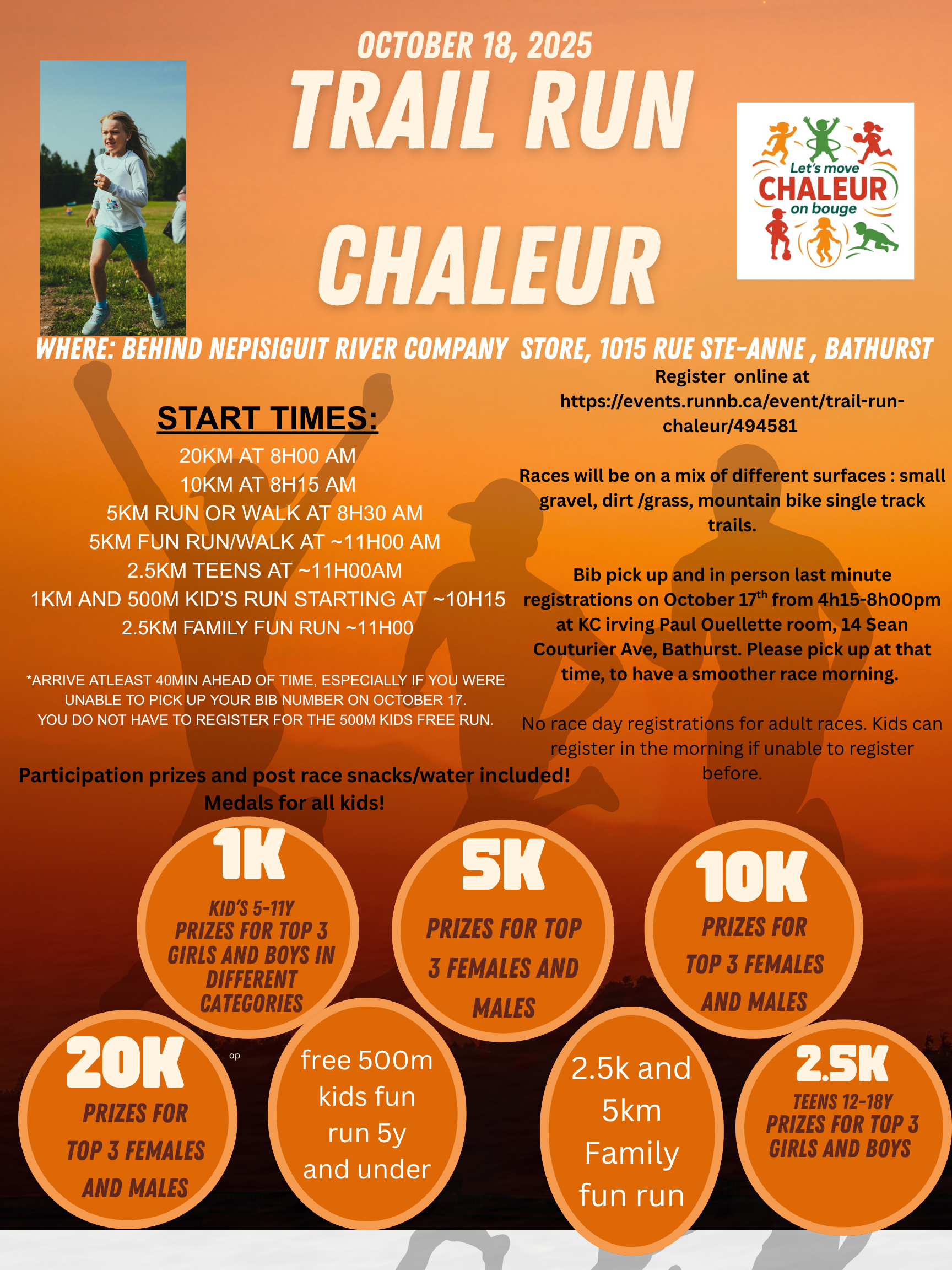 - Lieu d’inscription : Last minute registrations and bib pick up on October 17 from 4h15-8h00 at KC Irving center, Paul Ouellette room, 14 Sean Couturier Ave, Bathurst.