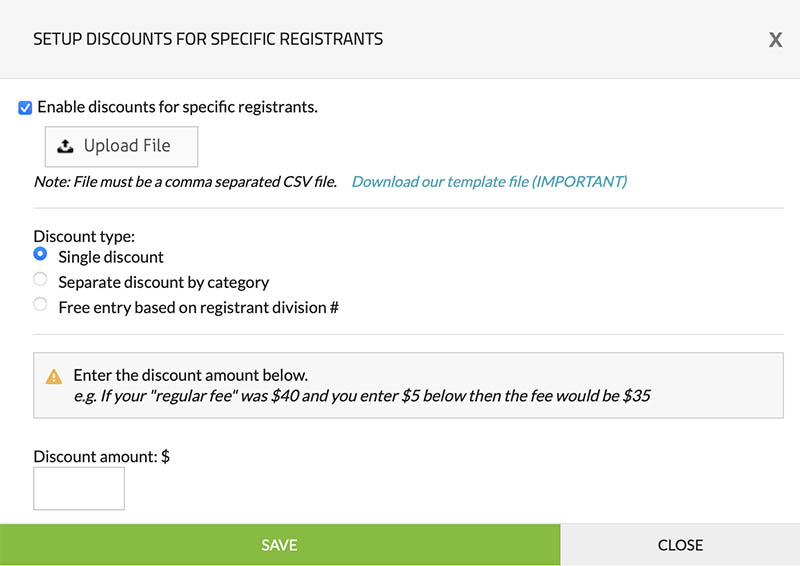 This feature allows you to upload a list of registrants' names to whom you want to provide a discounted rate.Below is what the interface for "+ Manage Discounts for Specific Registrants" looks like.