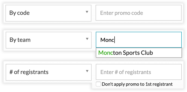 Based on the type of promotion you have selected, this input field will allow you to enter the promotional code, team affiliation, or number of registrants, as shown in the image below.