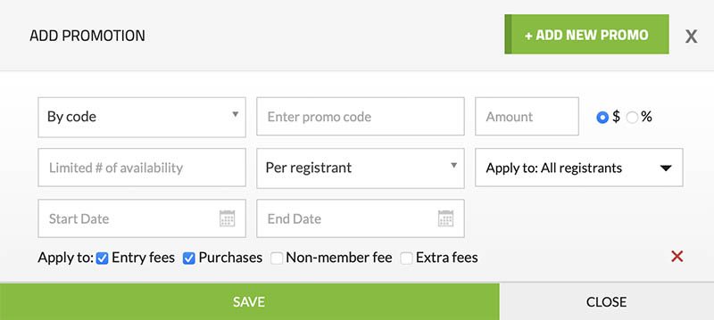 This feature enables you to create promotional codes, offer discounted rates based on registrants' team affiliation, or provide discounts based on the total number of registrants.Below is what the interface for "+ Manage Promotions" looks like.