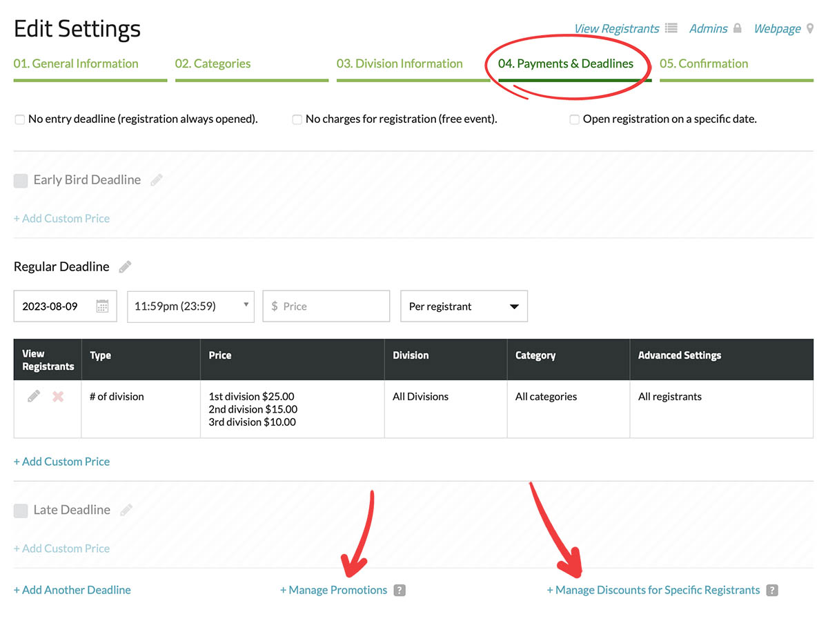 There are various options available for setting up promotions that can provide discounts to specific registrants during the registration process. To access this setting, you need to first create a registration form. Once created, in your settings navigate to the "Step 4: Payments & Deadlines" section. Here you will find two sections available for setting up discounts and promotions, "+ Manage Promotions" and "+ Manage Discounts for Specific Registrants".