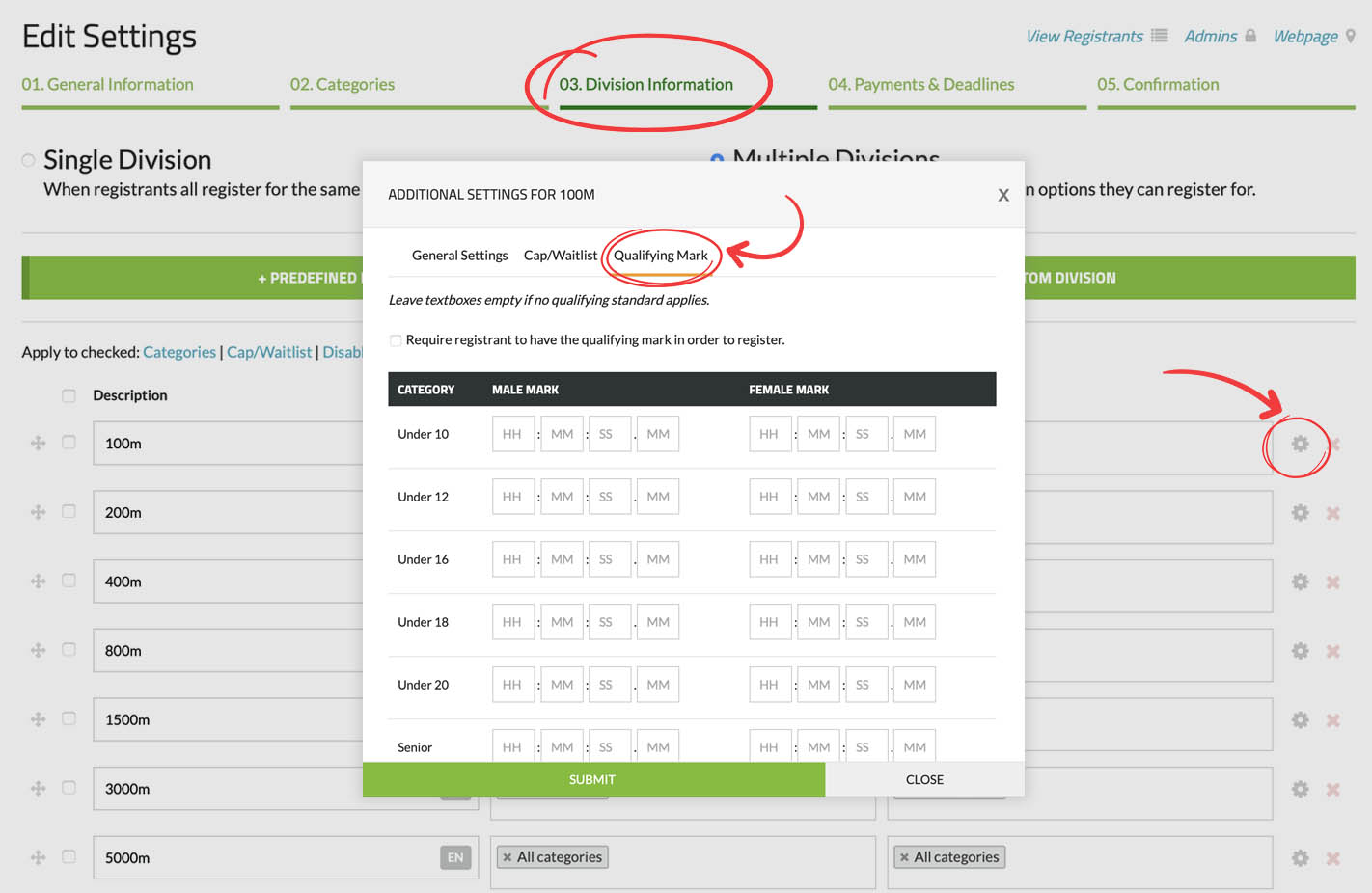 To access the settings for managing qualifying marks you need to first create a registration form. After creating an event, you can find this setting by navigating to "Step 3: Division Information". Next, click on the "gear" icon situated to the right of the division, and then select the "Qualifying Mark" tab. The interface for managing qualifying marks is displayed below.