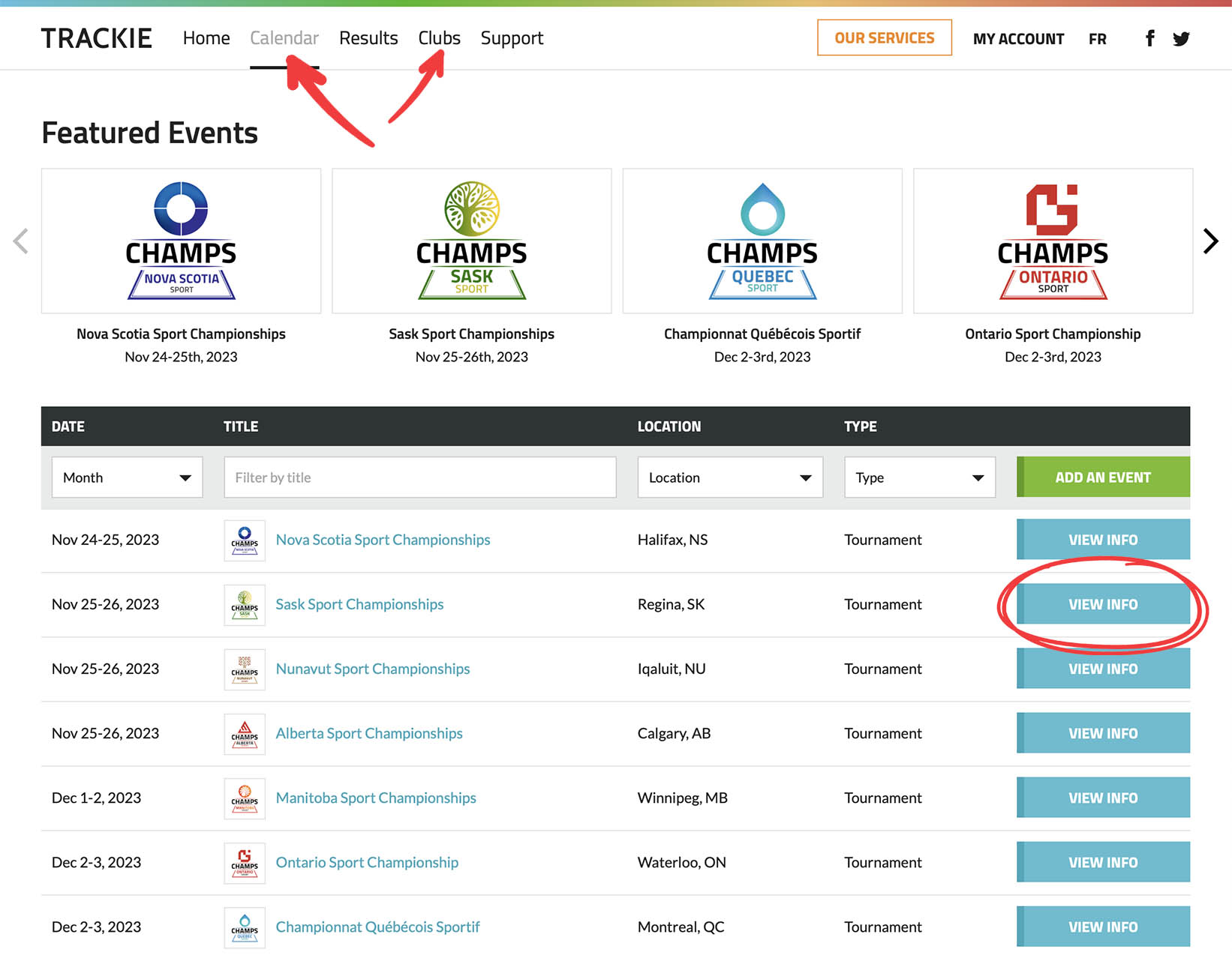 Click the "VIEW INFO" button next to the event or club you are interested in registering for.
