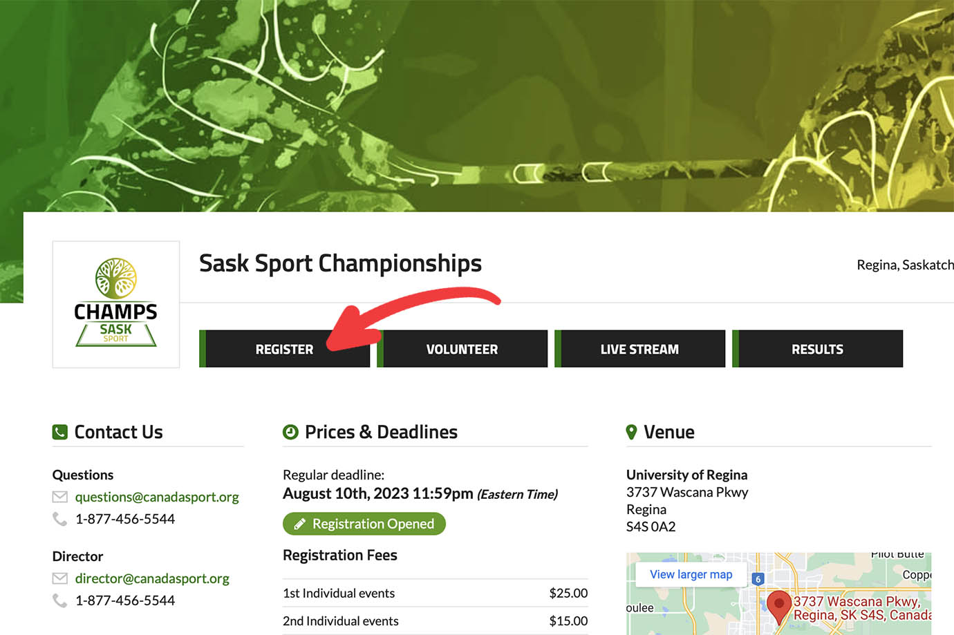 Upon clicking the "VIEW INFO" button, you will be either directed to a webpage where you can access detailed information about the event or club. In this case to proceed with registration, click on the "Register" button. If the event or club is not utilizing our webpage feature, you will be automatically redirected to their registration form.
