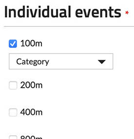 If the event or club offers multiple divisions or individual events to choose from during registration, you will be able to select them here. The options may be presented as drop-down menus or checkboxes, depending on the settings of the event or club.