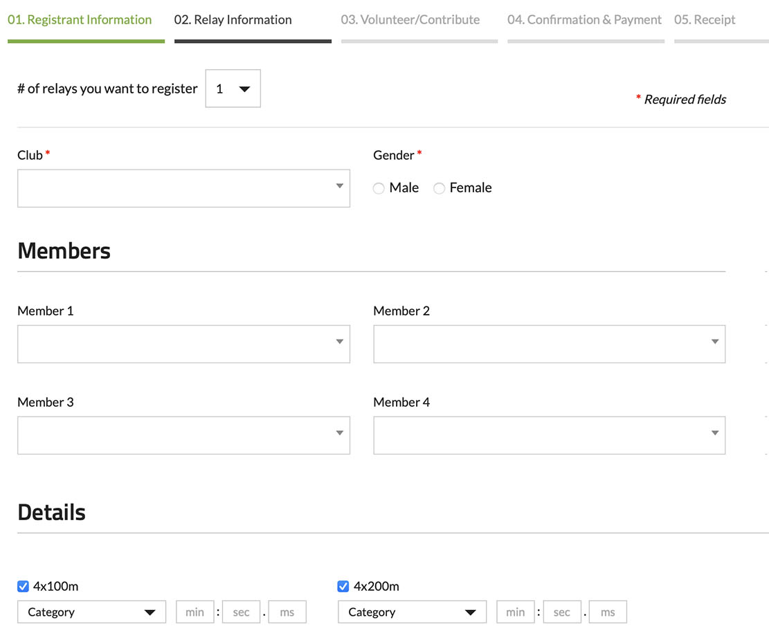 - Relay Information: If the event includes team-type events (e.g., "Relays" in athletics or "Team Kata" in karate), this step is where you can enter all the necessary information for your team-type entries, such as team members' names. (+) Show example