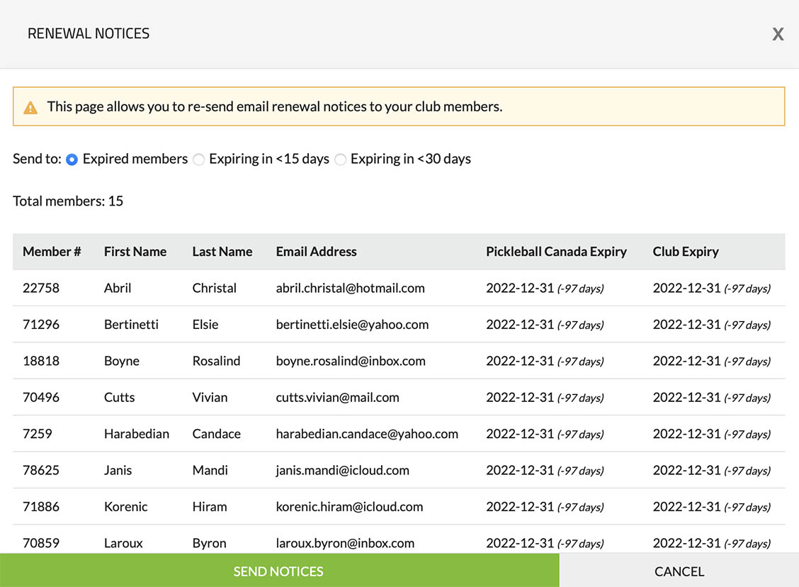 2. Expiring in <15 days: Send notices to members whose expiration is less than 15 days away.